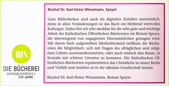 Im Bistum Speyer gibt es knapp 100 Katholische Öffentliche Büchereien mit rund 750 ehrenamtlichen Mitarbeiterinnen und Mitarbeitern. Mit großen persönlichen Engagement tragen die vielen Ehrenamtlichen christliche Werte in unsere Gesellschaft. Durch dieses Tun wird jede Bücherei auf ihre Weise zu einem Treffpunkt und einer Begegnungsstätte in der Gemeinde. Hier gibt es aktuellen Lesestoff für Jung und Alt - auch eMedien. Außerdem werden zahlreiche Veranstaltungen für Kinder und Erwachsene angeboten. Büchereien bringen Menschen und Bücher zusammen.