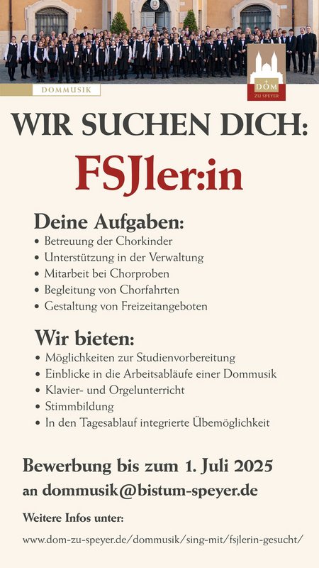Haben wir Ihr Interesse geweckt? Dann bekommen wir gerne bis 1. Juli 2025 eine Bewerbung (bitte nur per Mail) von Ihnen an dommusik@bistum-speyer.de.