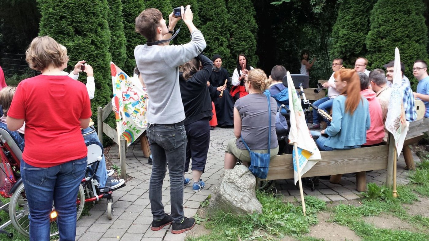 Am Abend wurde dann gegrillt. Dann gab es eine Überraschung: die „Spielleut Ranunkulus“ mit mittelalterlichen Instrumenten und Kleidern sangen und spielten für uns. Natürlich durften alle mitmachen. Zum Abschluss gab es dann einen Umzug, an dem auch „unsere“ Loreley und unsere selbstgestalteten Fahnen teilnahmen.