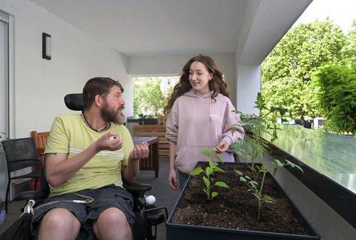 Reiner Kuntz und Ulrike Pfaff betreuen an der Tagesstätte des Caritas-Förderzentrums St. Johannes & St. Michael Ludwigshafen je eine Gruppe von Kundinnen und Kunden, die die Pflege von Pflanzen und Grünanlagen übernehmen. Zur Aufgabe der Gartengruppe gehört auch die Pflege der Pflanzen auf den Balkonen und in der Außenanlage des Förderzentrums. © Klaus Landry