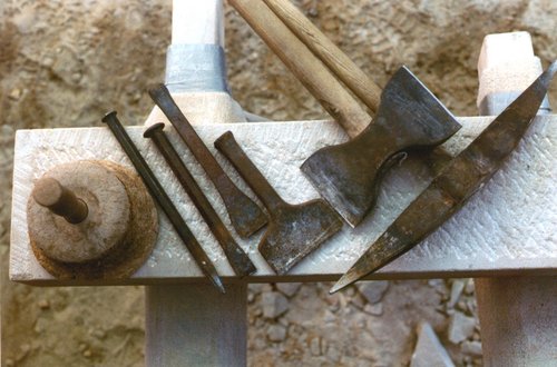 Fotos: Die Jesuitengruft © Foto: Domkapitel Speyer; Steinmetzwerkzeug © Foto: Domkapitel Speyer; Die Apsis des Speyerer Doms © Domkapitel Speyer, Foto: Klaus Landry