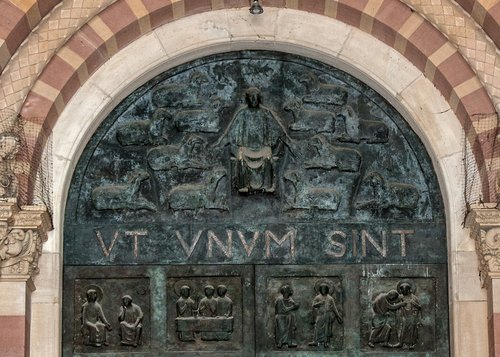 Christus als guter Hirte, Darstellung auf dem Tympanon des Hauptportal des Doms von Toni Schneider-Manzell