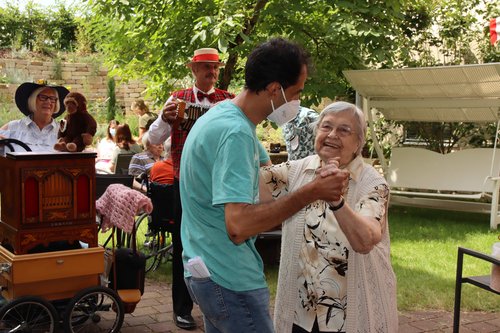 Ein paar Meter weiter hat sich Bewohnerin Adelheid Lazar zum Drehorgelteam Ingrid und Gerhard Gerach gesellt. Die Seniorin krault das Plüsch-Äffchen auf dem Drehorgelkasten am Kinn und freut sich schon auf die Musik. Als die beiden Musiker mit Akkordeon und Drehorgel loslegen, juckt es der Seniorin sichtlich in den Füßen. In Samer Alhalabi von der sozialen Betreuung findet sie ihren Tanzpartner, zusammen legen die beiden ein Tänzchen aufs Parkett. Drinnen aus der Cafeteria hört man einige Bewohner im Takt mitklatschen.