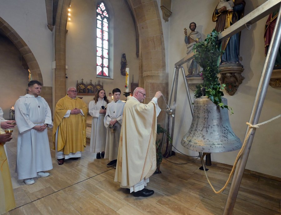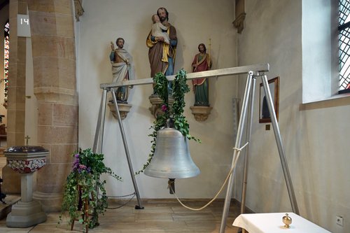Während der aktuell laufenden Renovierung des Germersheimer Kirchturms wird auch der Glockenstuhl erneuert, in dem die Kirchenglocken aufgehängt sind. Dabei zeigte sich, dass für eine weitere Glocke Raum wäre, die zusätzlich das bisherige Geläute vervollständigen könnte. Fündig wurde die Germersheimer Gemeinde dazu im Saarland: In Saarbrücken stand eine passende Glocke einer aufgegebenen evangelischen Kirche zur Verfügung. Aus Spenden sollen Erwerb, Aufarbeitung und Transport der Glocke bestritten werden. Von den erforderlichen 8.000 Euro sind bereits drei Viertel zusammengekommen. Künftig erhebt das 325 Kilogramm schwere Instrument seine Stimme also nicht mehr an der Saar, sondern am Rhein. Bis sie und ihre größeren „Kolleginnen“ aber auf dem Turm erklingen, wird noch etwas Zeit vergehen – zunächst müssen alle Bauarbeiten beendet sein, wie Pfarrer Rubeck erläuterte. Für die „Glockenweihe“ – liturgisch korrekt ist es eine Segnung – wurde die neue Glocke daher im Seitenschiff der Kirche aufgehängt, wo sie auch jetzt noch zu bewundern ist. Eine Prägung nennt das Jahr des Glockengusses: 1935.
