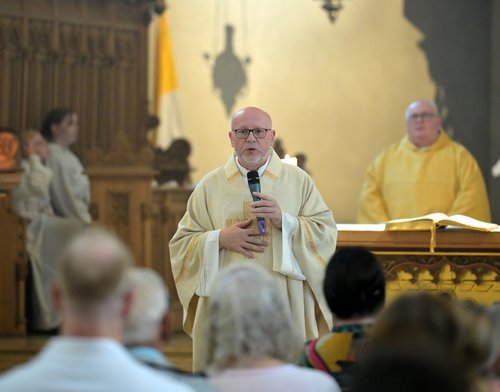 An die Zeit des Nationalsozialismus erinnerte Generalvikar Magin auch in seiner Predigt: „Mehr als 100.000 Glocken mussten nach 1940 für Kriegszwecke abgegeben werden, davon drei auch in Germersheim. Nur jeweils eine, die kleinste, durfte noch auf den Türmen bleiben.“ Weil das Material der Glocken für Waffen- und Munitionsherstellung dienen kann, gelte bis heute der Satz: „Wo Glocken schweigen, da brüllen die Kanonen. Und wo Glocken läuten, da läuten sie für den Frieden.“ Die Nazis hätten vorgehabt, letztlich alle Glocken von den Kirchtürmen zu holen, um so auch den Glauben zum Verstummen zu bringen. „Nur ganz wenige Glocken sollten erhalten bleiben und dann in Berlin für den ,Endsieg‘ und für Hitler ertönen.“ Statt zur Ehre Gottes hätten die Glocken somit für eine Unrechts-Ideologie und einen einzigen Menschen geläutet. „Auch heute erleben wir wieder, dass die freiheitlich-demokratische Gesellschaft gefährdet ist.“ Die Glocken läuteten daher stets auch für die Freiheit. Außerdem verwies Magin auf die Rolle der Glocken im religiösen Leben: „Glockenklänge laden zu Gebet und Gottesdienst ein. Wenn die Glocken klingen, sagen sie uns: ,Kommt zusammen, seid keine Einzelgänger, sondern pflegt Gemeinschaft.‘“ Mehrere Glocken, die ein Geläute bilden, erzeugen im Zusammenklang einen Akkord. Die neue Glocke übernimmt in Germersheim künftig den Leitton, führte Magin aus. Sie stelle so etwas wie einen Leitgedanken dar: „Wenn wir Gottesdienst feiern, tun wir es nicht nur für uns selbst, sondern um unseren Dienst in der Welt zu tun.“ Gottesdienste leiteten uns an, hinauszugehen und in der Welt Segen zu sein.