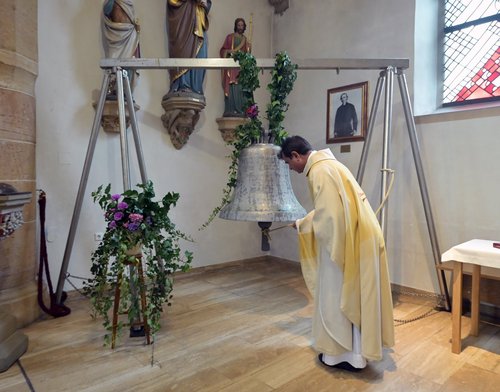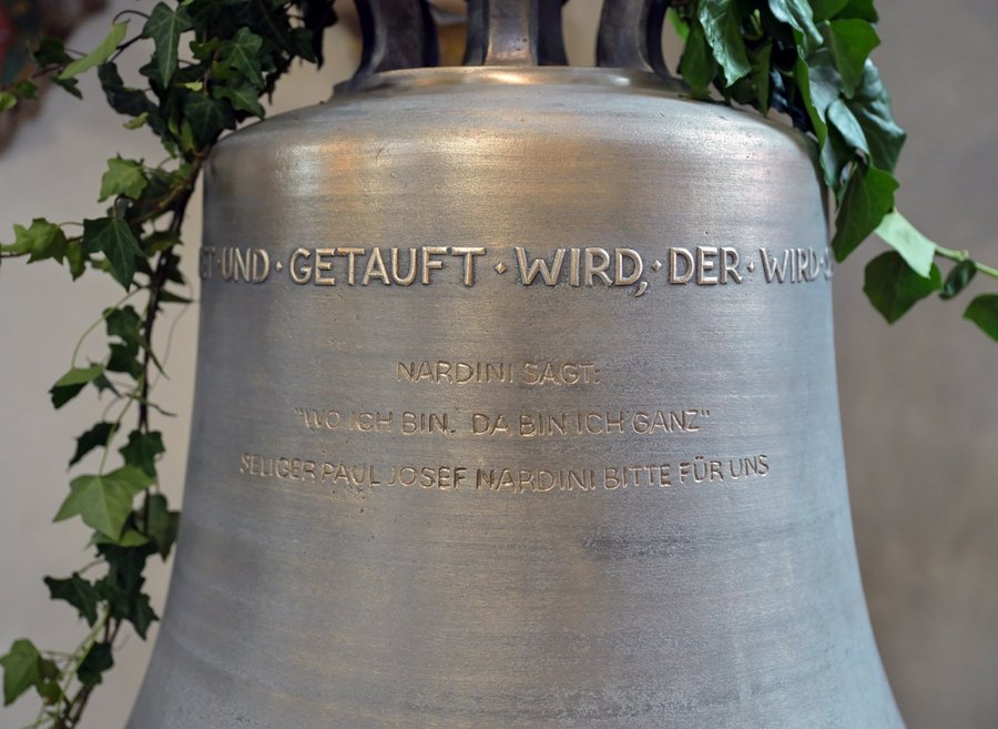 Am Ende des Segensritus mit Gebet, Weihwasser, Weihrauch und der Salbung mit Chrisamöl erklang die Glocke dann erstmals, angestoßen von Dekan Rubeck. Danach kamen auch Generalvikar Magin und Kaplan Bala Jujugiri zum Zug, sowie alle Messdienerinnen und Messdiener, während die Gottesdienstgemeinde ein Lied zu Ehren von Pfarrpatron Paul Josef Nardini sang. Denn ihm ist die neue Germersheimer Glocke gewidmet. Nardini kam 1821 in Germersheim zur Welt, seit 2016 trägt die katholische Pfarrei seinen Namen. Auf der Glocke hat Nardini ebenfalls eine Spur hinterlassen: Dort ist jetzt neu ein Zitat des 1862 in Pirmasens verstorbenen Priesters in den Stahl eingeprägt: „Wo ich bin, da bin ich ganz“.