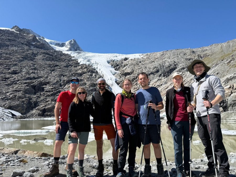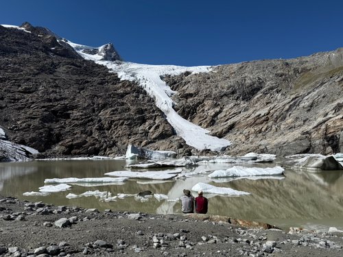 Gegen Mittag erreichen wir mit ein bisschen Kraxelei unser Ziel, den Gletschersee. Bizarre Eisschollen treiben im milchigen Wasser und um den See hat sich eine karge und kunstvolle Landschaft aus Sand und Geröll gebildet. Die Gletscherzunge reicht kaum noch bis zum See hinunter, lässt aber erahnen, wie mächtig das Eis noch vor ein paar Jahrzehnten gewesen war. An diesem Ort lassen wir uns lange Zeit zum Verweilen – eine Zeit, die vielen der jungen Menschen in Erinnerung bleibt. „Ein unvergesslicher Herzensmoment war es, zum ersten Mal so nah an einem Gletscher zu sein“, erinnert sich Jana, die ebenfalls Psychologie in Landau studiert. „Der Anblick des Gletschers bleibt mir besonders im Herzen – und das Bedauern, dass diese vergehen,“ meint Erik, ein Student an der HWG in Ludwigshafen, nachdenklich. Die Vergänglichkeit so hautnah zu sehen, beschäftigt auch Michael – angehender Sonderpädagoge aus Landau – , der anhand alter Karten die Ausdehnung der Gletscher von früher und heute vergleicht.