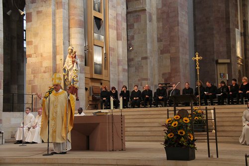 Bereits in seiner Begrüßung machte Bischof Wiesemann deutlich, dass in diesen Tagen kein Platz für Selbstherrlichkeit sei. In seiner Predigt fuhr er fort „Gott ist größer als jedes Haus, das wir ihm bauen. Selbstherrliche Vermessenheit ist hier nicht am Platz.“ Der von Menschen Haus Gottes gebaute Speyerer Dom sei ein Ort, wo die Menschen Gott nahe sein könnten, „mit allem was sie mitbringen, Schönheit oder Schmutz“. Große Theologen hätten Überlegungen angestellt, was die Ursünde der Menschheit sei. Oft sei hier die Vertreibung aus dem Paradies und die Entfernung von Gott genannt worden. Vielleicht sei aber, so Bischof Wiesemann in seiner Predigt, gerade das Abhandenkommen der richtigen Distanz zu Gott die Ursünde. Denn wenn ein Mensch versuche zu Gott zu werden, müsse er scheitern und vieles, was nicht gottgleich sei, müsse verdrängt und versteckt werden. Den Dom bezeichnete der Bischof als einen von Menschen gebauten Ort, wo man vor Gott treten könne. Die beinahe 1000 Jahre alte Kathedrale nannte Wiesemann ein „Zeichen des großen Atem Gottes, seiner Geduld, seiner Menschenfreundlichkeit, die jedoch nichts unter den Tisch fallen lässt“. Dadurch dass Gott selbst am Kreuz die Abgründe des menschlichen getragen habe, könne der Mensch mit allem, was er in sich trage vor Gott treten und „zerbrochenes kann von innen heraus geheilt werden“, so der Bischof am Ende seiner Predigt.