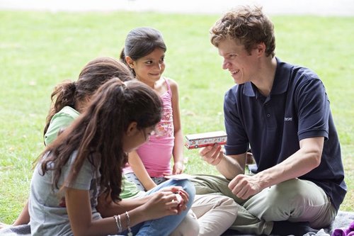 Geflüchtete Kinder erkunden am KLUG-Aktionstag gemeinsam mit Mitarbeitenden der DDG-Digital Devotion Group die heimische Umwelt.