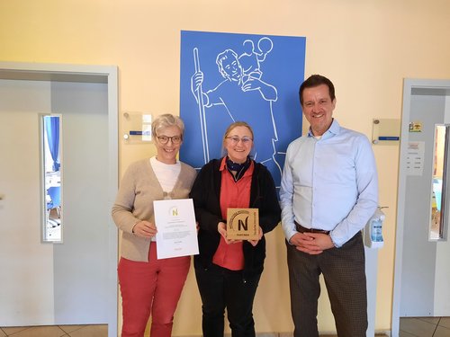 Nun fand sich ein Termin zur Übergabe im Jugendhaus. Gerrit Altes und Andrea Weber vom Bereich Tourismus der Stadt Bad Dürkheim kamen zum Austausch mit der Hausleitung Martin Jochem und Ulrike Weber und überreichten Urkunde und Partnerschild. Für das Team gab es noch einen Secco der Lebenshilfe und für das Haus eine einpflanzbare Dankeskarte.