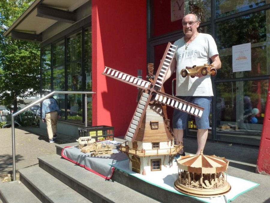 Eines seiner größten und aufwändigsten erregt Aufsehen: . eine Windmühle mit allem Drum und Dran und fast mannshoch. 22 Meter schmaler Holzleisten hat er darin verbaut, sie in Form gesägt, geschliffen und lasiert. Eine wahre Meisterleistung, die viel Zeit und Fingerspitzengefühl verlangt hat. „Na ja, es hat schon eineinhalb Jahre gebraucht, bis ich damit fertig war.“ Aber die Mühe hat sich gelohnt, die Mühle wird allseits bestaunt, und auch das liebevoll gestaltete Karussell findet seine Bewunderer. „Früher habe ich viel gemalt“, berichtet Jakob Moritz und verweist auf das Aquarell und die Bleistiftzeichnung, die in der Ausstellung zu sehen sind. „Damit habe ich die Abende verbracht, wenn ich auf Montage war. Denn einen Zeichenblock, Farben und Stifte konnte ich gut mitnehmen.“ Jetzt im Ruhestand ist es das Holz, dem er sich widmet, oft bis in den späten Abend hinein.