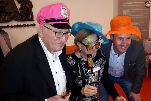 Ein Jubiläumsgeschenk hatte Annette Schenk auch noch: Alle Anwesenden bekamen eine Rose als Anspielung auf die Legende, die besagt, dass sich das Brot, das die Heilige Elisabeth verbotenerweise zu den Armen brachte, bei einer Kontrolle in Rosen verwandelt hat. Außerdem hatte Kirstin Fischer, die Leitung des Sozialdienstes, eine Photobox und einen Tisch voll Requisiten organisiert. In lustiger Verkleidung begannen die ersten Bewohner, Mitarbeiter und Gäste schon vor dem Mittagessen, Selfies zu fotografieren - als schöne Erinnerung an ein schönes Fest.