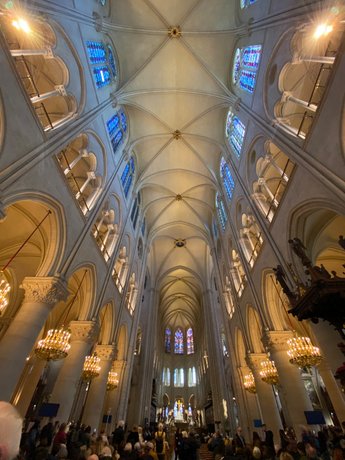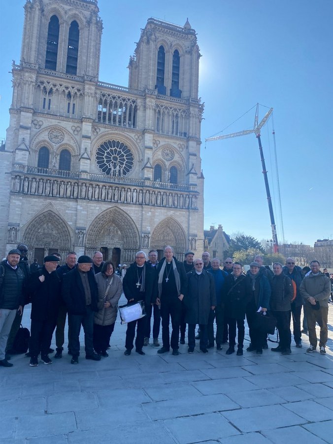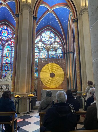 Am zweiten Tag unserer Reise besuchtem wir Paris. Zielstrebig steuerten wir Notre-Dame an, die im letzten Dezember wiedereröffnet worden ist. Der helle Stein und die leuchtenden Fenstern begeisterten die Menschenmassen, die sich langsam durch die Kathedrale drängten. In einem großen goldenen Schrein wird die Dornenkrone Christie verehrt. Gemeinsam mit Bischof Philippe und Bischof Karl-Heinz feiern wir die 12:00 Uhr-Mittagsmesse, an der zahlreiche Touristen teilnahmen.