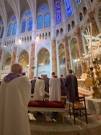 Nach dem Mittagessen und der Führung durch das Theologenseminar College des bernardins führte uns Bischof Philippe durch Paris und zeigte sehenswerte Kirchen, wie beispielsweise St. Étienne du Mont und St. Suplice. Den Höhepunkt des Nachmittags bildete der Besuch von Sacré-Cœur de Montmare mit der fantastischen Aussicht über die Stadt und Zeit zur stillen Anbetung und für die gesungene französische Vesper.