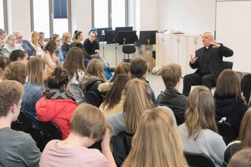 Weiterer Höhepunkt im Tagesprogramm: das Gespräch mit der Bistumsleitung. Neben Bischof Dr. Karl-Heinz Wiesemann stellten sich die Domkapitulare Franz Vogelgesang und Josef Damian Szuba den kritischen Fragen. Ein Thema sprachen die Schüler jedem Tag an: Warum können Frauen in der Kirche nicht die gleichen Ämter wie Männer übernehmen? Bischof Wiesemann erläuterte den Ursprung des Priestertums, dass Jesus es an seine Jünger übertragen hat. Daneben habe es in der Kirche stets sehr aktive Frauen gegeben, die großen Einfluss nahmen. Bei der Diskussion um Diakoninnen "tut sich die Kirche schwer", räumte der Bischof ein und betonte: "Was die Würde betrifft, gibt es in der Kirche keinen Unterschied zwischen Frau und Mann." Bei der Frage nach dem Zölibat erläuterte er ebenfalls die Hintergründe, wie das Gebot der Ehelosigkeit entstand und blickte nach vorn: "Es kann sein, dass sich am Pflichtzölibat etwas tut." Er erklärte die Haltung der Kirche gegenüber Homosexualität und diskutierte mit den Schülern über das Thema Missbrauch in der Kirche. Er erklärte wie Vorsorge getroffen wird, um künftig solchen Taten vorzubeugen, und wie Aufklärung betrieben wird. Er versicherte: "Wir nehmen jeden Fall ernst". Der Bischof gewährte den Schülern Einblicke in sein privates Leben, etwa als er die Frage nach seiner Berufung beantwortete. Lehrerin Doris Eichert vom Siebenpfeiffer-Gymnasium aus Kusel zollte dem Bischof Respekt: "Er hat sich bei theologischen Themen sehr kritisch und zeitgemäß gezeigt und ist offen auf die Fragen der Schüler eingegangen."