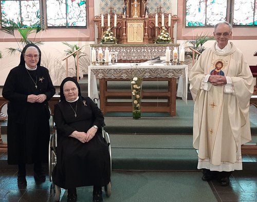 Herxheim. Am Tag der Deutschen Einheit, 03. Oktober 2020, begingen Sr. M. Irmina Sold und Sr. M. Irmtraud Haberzettl ihr 65-jähriges Professjubiläum. In einem Festgottesdienst unter der musikalischen Leitung des Stiftsorganisten Stefan Wingerter brachte die Schwesterngemeinschaft im St. Paulus Stift zu Herxheim bei Landau/Pfalz ihre Freude und ihren Dank zum Ausdruck.