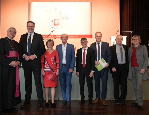 (von links):Bischof Dr. Karl-Heinz Wiesemann, Sozialminister Alexander Schweitzer, Caritasdirektorin Barbara Aßmann, Caritasdirektor Vinzenz du Bellier, der scheidende Caritasvorsitzende Domkapitular Karl-Ludwig Hundemer, Landrat des Landkreises SÜW Dietmar Seefeldt, Caritasratsvorsitzender Theo Wieder und die Präsidentin des Deutschen Caritasverbandes Eva-Maria Welskop-Deffaa.