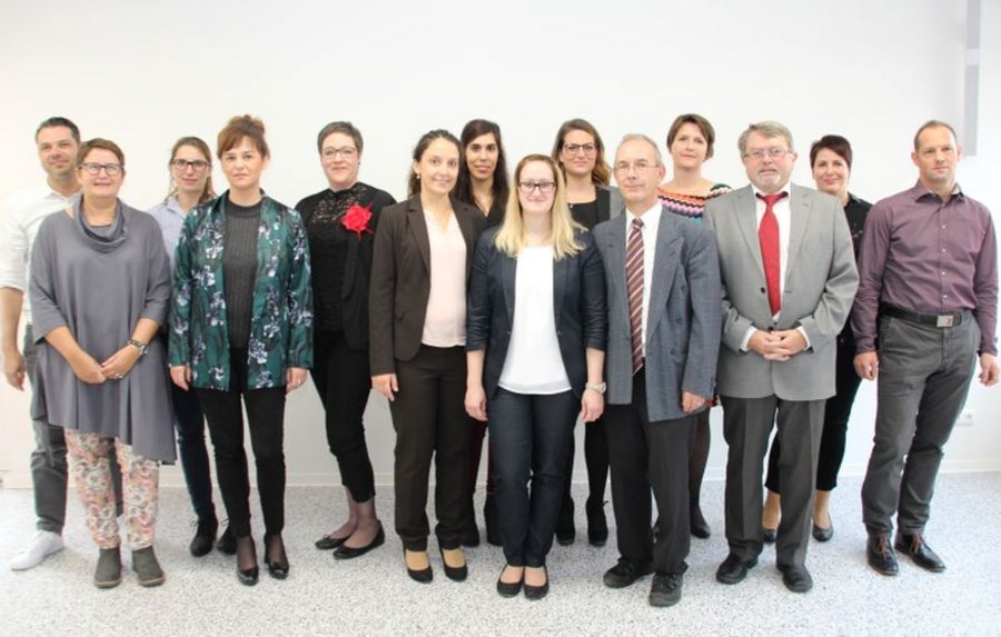 Die erfolgreichen KursteilnehmerInnen (von links): Frank Schreieck, Katja Stopfer, Melanie Backenstrass, Stefanie Kreutz, Katrin Klehr, Marlen Bauer, Demet Hatip, Anna Dax, Katharina Amend, Franz Rinck, Beate Czodrowski, Dietmar Gehring, Annette Martin und Oliver Weckbach.