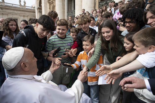 Hautnahe Begegnung mit dem Papst: Jungen und Mädchen der Speyerer Dommusik geben Papst Franziskus die Hand © Vatican Media
