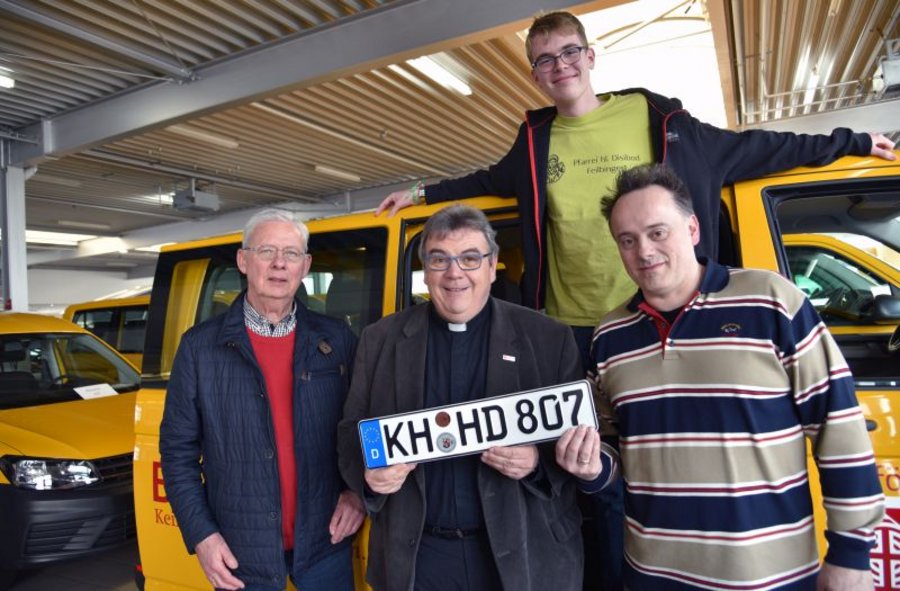 Die BONI-Bus-Empfänger in Feilbingert: Franz Rudolf Zimmermann (v. l.), Monsignore Georg Austen, Julian Ropertz, Wolfgang Justenhoven.