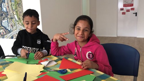 Der Treff liegt prominent im Stadtteil, an der Ecke Slevogtstraße – Käthe-Kollwitz-Straße. Gegenüber liegt der Spielplatz und um die Ecke ist auch die städtische Spiel- und Lernstube. Der bunte Stand vor der Glasfront des Treffs mit seinem roten Teppich, roten Sitzsäcken, roten Stehtischen, mit Caritas-Sonnenschirmen und Pavillon – und natürlich mit dem roten Tour-Bus – erregte Aufmerksamkeit. Kinder kamen vorbei und freuten sich über Gummibärchen und Minze-Bonbons. Sie trauten sich auch über die Schwelle in den Treff hinein, wo sie die Fotobox entdeckten und sich mit Werteschildern, mit ihrem Gebastelten oder mit den mitgebrachten Verkleidungen fröhlich fotografieren ließen. Die beiden Quartiersmanagerinnen Jeannine Uchej und Corinna Hauck hatten Buntpapier, Kleber, Stifte und Scheren dabei und zeigten den Kindern, wie man bunte Caritas-Monster basteln konnten. Kerstin Brechtel von der benachbarten Pfarrei St. Konrad besuchte den Treff und hatte eine Lesekiste mitgebracht und Utensilien, um kleine Percussion-Eier zu basteln – mit Plastik-Ostereiern und Hirse.