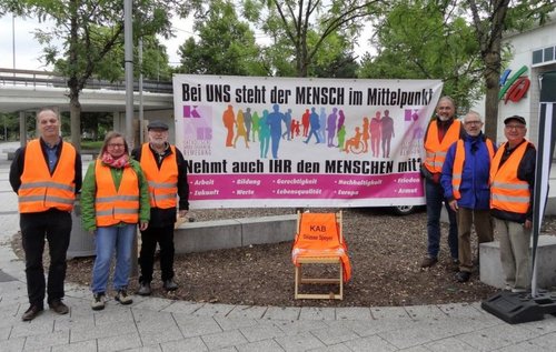 Speyer/ Ludwigshafen. Es sah aus wie ein Stand einer Partei zur Bundestagswahl: Doch hier ließ sich niemand wählen. Dafür gab es Kaffee und Informationen satt. Die Katholischen Arbeitnehmer-Bewegung (KAB) in der Diözese Speyer fragte mit einem riesigen Transparent: "Nehmt Ihr den Menschen mit?" Helfer der Aktionsgruppe in leuchtend rote Warnwesten gehüllt, verteilten gedruckte Wahlprüfsteine. Diese hatte der Arbeitskreis Frauen der KAB bei einer Bildungswoche entworfen.