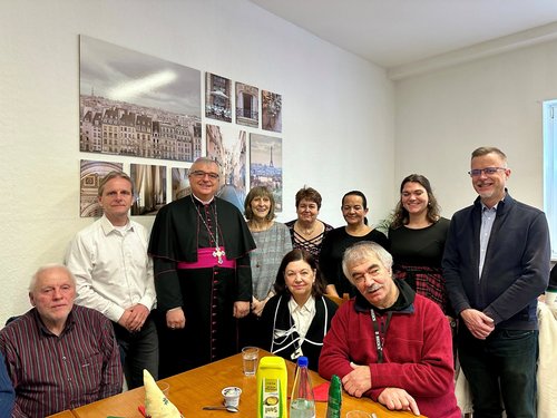 Die Gruppe um Bischof Wiesemann: Peter Lehmann (St. Christophorus Gesamtleiter), Siglinde Lauer, Maria Kowatsch, Jasmin Rothe, Rosa Gosbee und Pfarrer Martin Olf (v. l. n. r.).