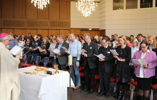 Im Rahmen des Begegnungstages feierten Bischof Wiesemann und Generalvikar Sturm mit den Mitarbeiterinnen und Mitarbeitern einen Gottesdienst.
