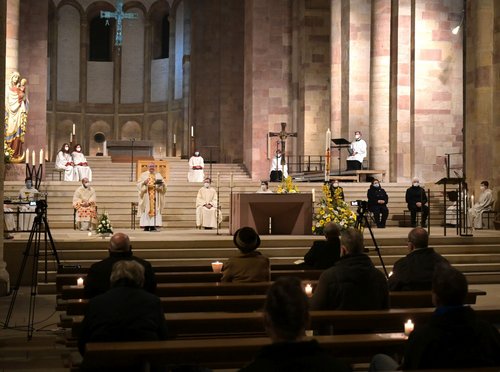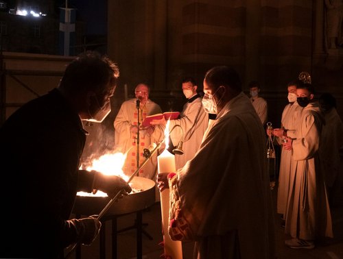 Im Speyerer Dom zelebrierte Weihbischof Otto Georgens in Vertretung für den erkrankten Diözesanbischof Dr. Karl-Heinz Wiesemann die Feier der Osternacht. In der Vorhallte des Domes wurde das Osterfeuer entzündet. Von dort aus wurde die brennende Osterkerze in den dunklen Dom getragen.