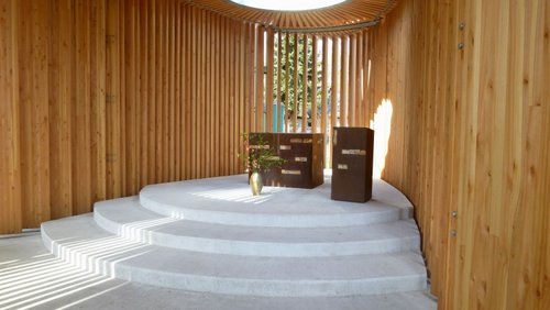 Lang, leicht und licht wirkt die Lamellenstruktur des Kirchenpavillons, der auf der hinteren Landschaftsachse der LGS nahe beim Aussichtsturm errichtet wurde. Er ist aus Douglasienholz, einem heimischen Forstbaum erbaut, zu allen Seiten hin offen und über dem Altarraum mit einer kreisrunden Öffnung gen Himmel versehen. Das Baukonzept des Architekturbüros „bayer I uhrig, Architekten BDA“ aus Kaiserslautern ist innovativ und nachhaltig. Die Statik sei ebenso herausfordernd gewesen wie die Umsetzung, berichten die Architekten, die sich wiederholt mit kirchlichen und liturgischen Räumen auseinandersetzten.