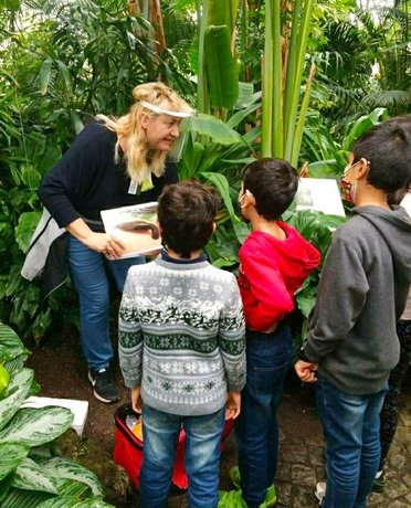 Die Umweltpädagoginnen Claudia Georgi-Dreher und Paula Eidel nahmen die Ausflugs-Gruppe mit auf eine interaktive Reise zu den Dschungelindianern und in die Bionik. Die Kinder durften auf Straußeneiern balancieren, an Kakaobohnen riechen und eine Riesenheuschrecke auf die Hand nehmen. Wetterbedingt fanden die parallelen Führungen im Pflanzenschauhaus statt. Trotz Maskenpflicht bei tropischen Temperaturen war die Begeisterung groß.