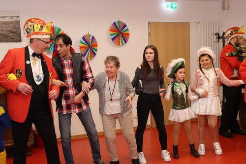 Spätestens jetzt war das Eis gebrochen, Zeit also für die erste Schunkelrunde. Vorne auf der Bühne schunkelte der Elferrat. Die Bewohnerinnen und Bewohner an den Tischen konnten das mindestens genauso gut. Einige hatten sich fantasievoll verkleidet, andere hatten bunte Herzen auf die Wange gemalt.