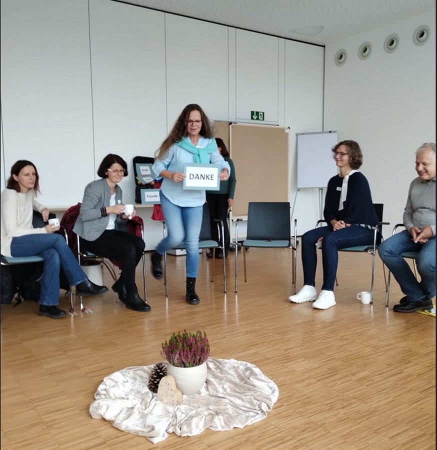 Zur Einstimmung auf den Tag wurde von Irmgard Müller und Alexandra Dellwo-Monzel, der schon mit Material prall gefüllte Workshop-Koffer ergänzt mit dem, was es für die Arbeit als MFM-Referent*in braucht. Es ging um GELASSENHEIT, KRAFT, ZUHÖREN, ZEIT, FREUDE,... Die WERTSCHÄTZUNG ist dabei quasi ins Kofferfutter eingenäht.