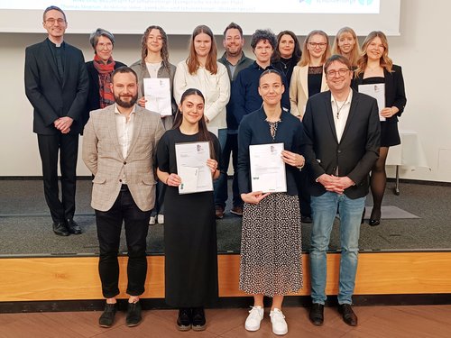 Die Träger*innen des Religionspreises 2025 mit ihren Lehrer*innen und Dekan Dominik Geiger © Anette Konrad