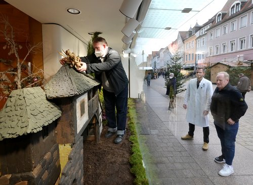 Nach den positiven Erfahrungen aus dem letzten Jahr werden auch in diesem Jahr verschiedene Figuren in den Schaufenstern von vier Geschäften der Innenstadt zu zeigen. Das Schuhhaus Bödeker stellt dafür ein großes Schaufenster zur Verfügung, in dem die zentrale Krippenszene mit Stall, heiliger Familie, Engel und einigen Hirten samt Schafen zu sehen sein wird. Die Domsakristane Markus Belz und Michael Flörchinger verbrachten drei Tage mit dem Aufbau. Weitere Figuren wurden in der Sonnenapotheke gegenüber positioniert. Außenposten bilden das Modehaus Schmitt in Richtung Osten und der Hörgeräteakustiker Leist Richtung Westen, neben der Gedächtniskirche. Rechtzeitig zum Vierten Adventswochenende waren alle Figuren an ihrem Platz. Das heißt, nicht alle Figuren: Maria und das Jesuskind kommen traditionsgemäß erst am 24. Dezember in den Stall, wenn die Geburt Christi gefeiert wird.