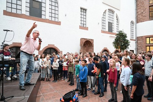 Nach zwei gemeinsamen Proben am Freitagabend und Samstagmorgen im Dom konnten die Jugendlichen die Stadt und den Dom bei Turmbesteigungen und Kryptabesuch näher kennenlernen. Am Abend fand ein offenes Singen für die Kinder und Jugendlichen im Forum des Historischen Museums der Pfalz unter Anleitung von Bertrand Gröger, dem renommierten Leiter des Jazzchors Freiburg, und dem Beatbox-Experten Julian Knörzer statt.