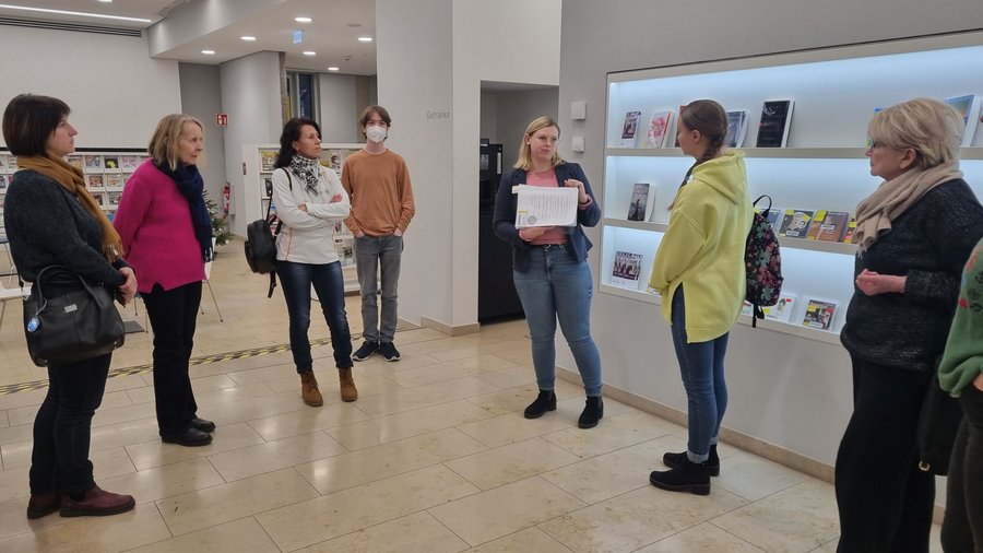 Bilder (Caritas-Zentrum): Teilnehmende des Sprachtreffs beim Besuch in der Stadtbibliothek
