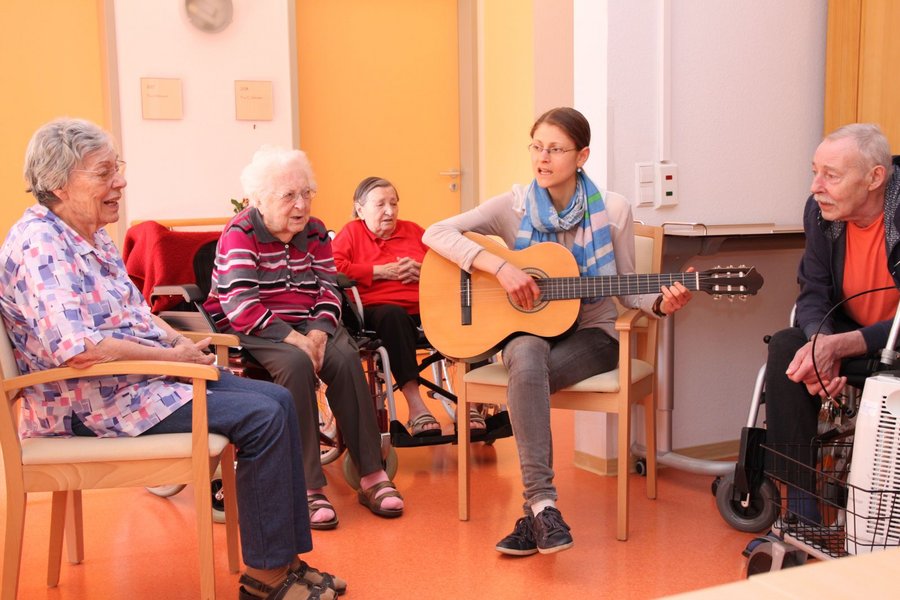 „Musik dockt direkt an das Emotionszentrum im Gehirn an. Oft kann ein dementer Mensch nicht mehr über die Sprache erreicht werden, doch wenn gesungen wird, erinnert er sich plötzlich wieder an die Melodie und die Texte. Oft können die Senioren viele Strophen eines Liedes mitsingen“, erzählt die 26-jährige Musiktherapeutin. Im Flur des Wohnbereichs sitzt sie mit zwei Frauen und einem Mann zusammen und beginnt ein Gespräch. Noch verläuft es sehr einseitig. Mehr als ein „ja, ja“, bekommt sie nicht zur Antwort. Der Mann beobachtet fasziniert die Gitarre, fragt, ob die Seiten gespannt sind, dann verfällt er in Schweigen. Eva-Maria Holzinger fängt an zu erzählen, schlägt vor, ein Sommerlied zu singen und stimmt: „Jetzt kommen die lustigen Tage“ an. Sofort fällt ihre Sitznachbarin mit ein, die Stimme ist brüchig, aber der Text sitzt. Auch die zweite und die dritte Strophe kommen ohne nachzudenken. Eva-Maria Holzinger freut sich, dass sie gut beim Singen unterstützt wird. „Was mal da sitzt, geht nicht so schnell raus“, sagt die alte Dame stolz und zeigt auf ihren Kopf. Mehr sagt sie heute nicht mehr, aber sie singt weiter mit, alle Strophen von Lilli Marlen. Dann kommt auch ein Trinklied und plötzlich fällt der alte Herr, der immer noch fasziniert auf die Seiten des Instruments schaut, in den Refrain mit ein.