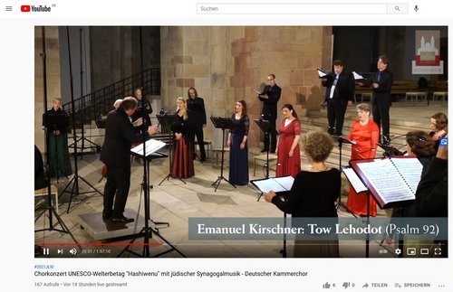 Das Konzert, das am Abend ebenfalls als reines Streaming-Angebot stattfand, ist ebenfalls weiterhin auf Youtube abrufbar. Der Deutsche Kammerchor bot mit seinem Programm „Haschiwenu: Bringe uns zurück“ jüdische Synagogalmusik dar. Der Chor nahm Zuhörer mit auf eine Reise durch das jüdische Festtagsjahr, auf der ein breiter Querschnitt des Repertoires zu erleben war, welches an den Synagogen Deutschlands bis zur Shoa erklungen ist. Ermöglicht wurde das Konzert des Deutschen Kammerchors durch die finanzielle Förderung von #2021JLID – Jüdisches Leben in Deutschland e.V. aus Mitteln das Bundesministerium des Innern, für Bau und Heimat“.