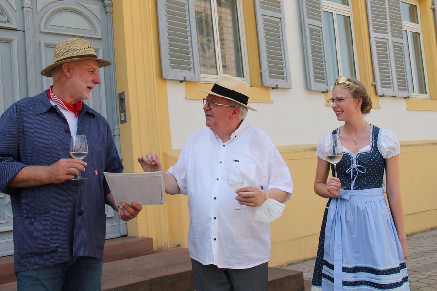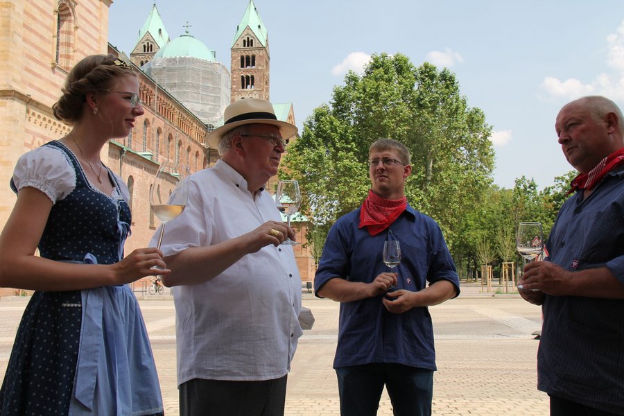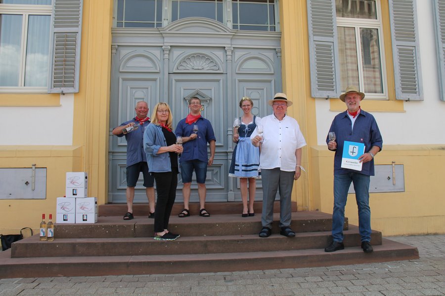 Zur Delegation aus der Südpfalz gehörten Beigeordnete Doris Janz, Weinprinzessin Marlen I., sowie Pirmin und Lukas Roth vom Weingut Roth, von dem der diesjährige Weinzehnt stammt.