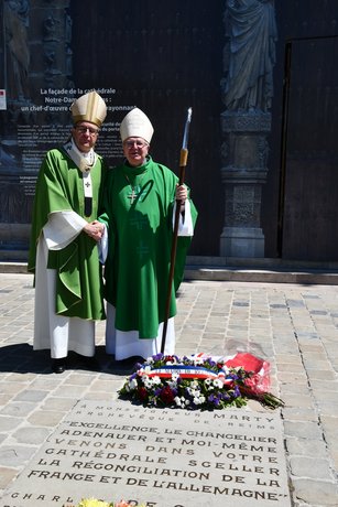 Die Plakette auf dem Boden vor der Kathedrale in Reims erinnert an den Gottesdienst vor 60 Jahren. Weihbischof Georgens (rechts) mit dem Erzbischof von Reims, Eric de Moulins-Beaufort.
