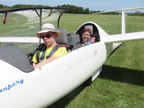 Gertrud Gerner, stellvertretende Diözesanvorsitzende des DJK-Sportverbandes, vertraut sich Felix im Cockpit des Segelfliegers an.