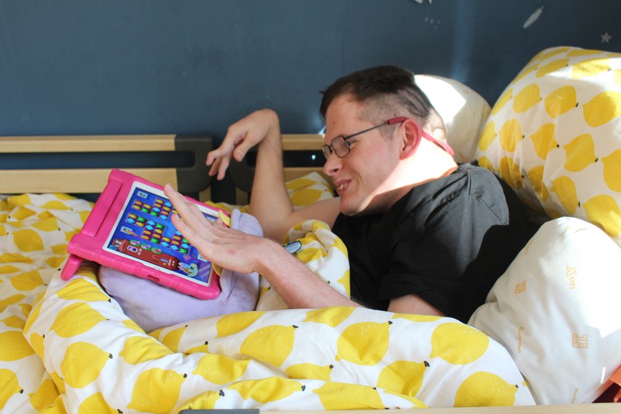 Mike Shkafi ist 24 Jahre alt und wohnt in der Wohngruppe gegenüber, bei den „jungen Wilden“. Einst als Kinderwohngruppe gestartet, wohnen hier nun junge Erwachsene und zwei Jugendliche. Shkafi ist mit vier Jahren in das Wohnheim eingezogen und hier aufgewachsen. Gerade hat er es sich in seinem Zimmer bequem gemacht und spielt sein Lieblingsspiel auf dem Tablet: „Candy Crush“, sagt er und grinst, sein Finger saust über das Tablet und lässt eine neue Reihe Bonbons explodieren. Mike liebt Hunde, er erzählt, dass Mitarbeiter manchmal ihre vierbeinigen Freunde mit ins Wohnheim bringen. „Es ist schöner hier, wenn die Hunde da sind“, sagt er.