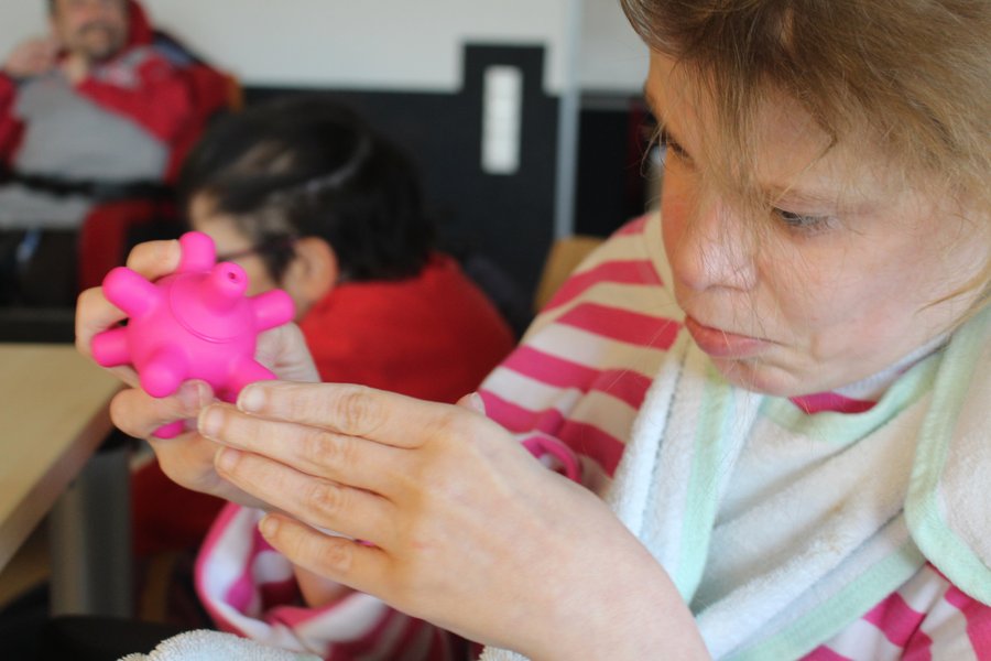 Die Stimmung ist gut an diesem warmen Frühlingstag. Laura Drumm (24) und Alina Ziegler (22) unterstützen die Bewohner in ihrem Alltag in der Wohngruppe. Tagsüber geht es in die Tagesförderstätte, die sich auch an dem Standort des Ökumenischen Gemeinschaftswerks in Landstuhl befindet. Im Wohnheim gibt es 50 Plätze, gelebt wird in verschiedenen Wohngruppen. Angela Daub zeigt Ziegler, was sie heute in der Therapie geübt hat: „Arme heben und strecken“ – „ganz schön anstrengend, ich brauche erstmal Schokolade“, resümiert sie. Tatjana Ballins Finger streichen nun über ein Tuch. Drumm bietet ihr einen Ball mit Noppen an. Ballin tastet und greift zu, sie summt nun lauter. Immer wieder lacht sie. Ihre blonden Haare leuchten in der Sonne. An ihrem Summen, dem Stimming (Abkürzung für self-stimulatory behavior, deutsch „selbststimulierendes Verhalten“) kann Drumm auch hören, wie es Ballin gerade geht. „Als es ihr gesundheitlich mal nicht so gut ging, wurde sie sehr leise.“