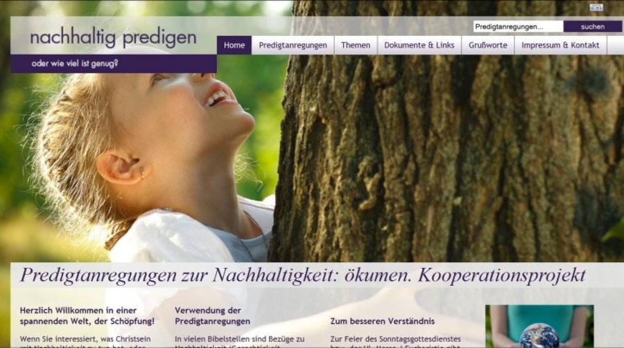 Das ökumenische Kooperationsprojekt „nachhaltig predigen“, das gemeinsam von 20 Bistümern und Landeskirchen in Deutschland und der Schweiz getragen und von „Brot für die Welt“ und dem Katholischen Fond gefördert wird, begann im Jahr 2005 an die Wurzeln des Prinzips der Nachhaltigkeit in der Bibel zu erinnern und stellt dazu für jeden Sonntag Predigtanregungen zur Verfügung. Bei der Auswahl der Bibelstellen orientieren sich die Autorinnen und Autoren konsequent an der evangelischen Perikopenordnung und an der katholischen Leseordnung für die Sonntage. Dabei wird deutlich: Predigende und Studierende der Schrift brauchen nicht mühsam zum Thema passende Bibelstellen zu suchen, die Bezüge sind vielfältig!