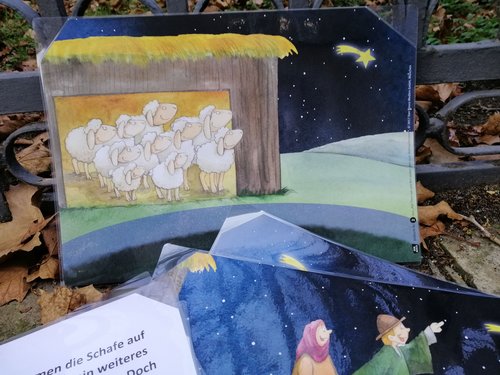 Während die Kinder die Bilder betrachten, können die Erwachsenen die Geschichte „Alle Tiere nach und fern folgen gern dem Weihnachtsstern“ aus dem Don Bosco Verlag vorlesen und mit den Kinder ins Gespräch kommen. So kann gemeinsam verfolgt werden, wie sich die Hirten mit ihren Schafen und anderen Tieren auf den Weg zum Stall machen, wo das Weihnachtsgeheimnis angedeutet wird.