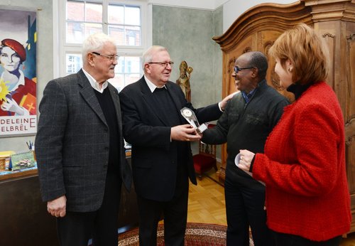 Samuel Husunu vom Vorstand des Vereins der Togofreunde bei der Überreichung der Auszeichnung in Speyer. Sie verwiesen unter anderem auf das Ausbildungszentrum in Gbalavé, in dem zur Zeit 90 Lehrlinge eine Ausbildung in verschiedenen Berufen erhalten. Weihbischof Georgens setze die Arbeit seines Vorgängers Domkapitular i.R. Gerhard Fischer fort, der viele Jahre als Leiter des Referats Weltkirche ebenfalls stark engagiert war für die Menschen in Togo, so Husunu.