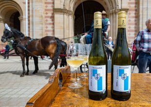 Die zweimal 132 Flaschen wurden als Geschenk der Gemeinde Kirrweiler an die Speyerer Bischöfe übergeben. Musikalisch umrahmt wurde die Weinzehntübergabe von den Original Sankt Martiner Weinschlauchdudlern.
