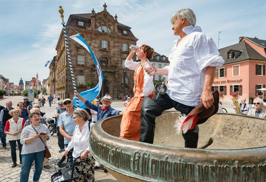Zum Gefolge aus der Südpfalz gehörten auch wieder „Gertrud von Kerrweiler“ (Louisa Weis) und „Georgius, Verwalter des göttlichen Weinkellers“ (Georg Weis), die, in historische Gewänder gekleidet im Domnapf stehend, Bischöfe und Publikum zur Zeremonie herbeiriefen. Georgius blickte zurück auf die Geschichte des Weinzehnts, der aus einer schwierigen Zeit stamme, in der viele Menschen hungern mussten. „Verdursten muss heutzutage Gott sei Dank keiner mehr. Merkt ihr eigentlich, wie gut es euch heutzutage geht? Manchmal kommen da Zweifel…“, mahnte er die Zuschauerinnen und Zuschauer. Für Georgius war es der letzte Weinzehnt, Georg Weis verabschiedete sich in Speyer von seiner Aufgabe. „Was gibt’s für einen Pfälzer schöneres als vorm Dom Abschied zu nehmen?“, schloss er.