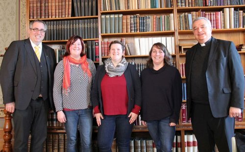 Die Sprecherinnen des Frauenforums (v.l.) Marie-Christin Mayer, Lena Schmidt, Ute Garth, trafen sich zum Gespräch mit Bischof Wiesemann (rechts) und Generalvikar Andreas Sturm.